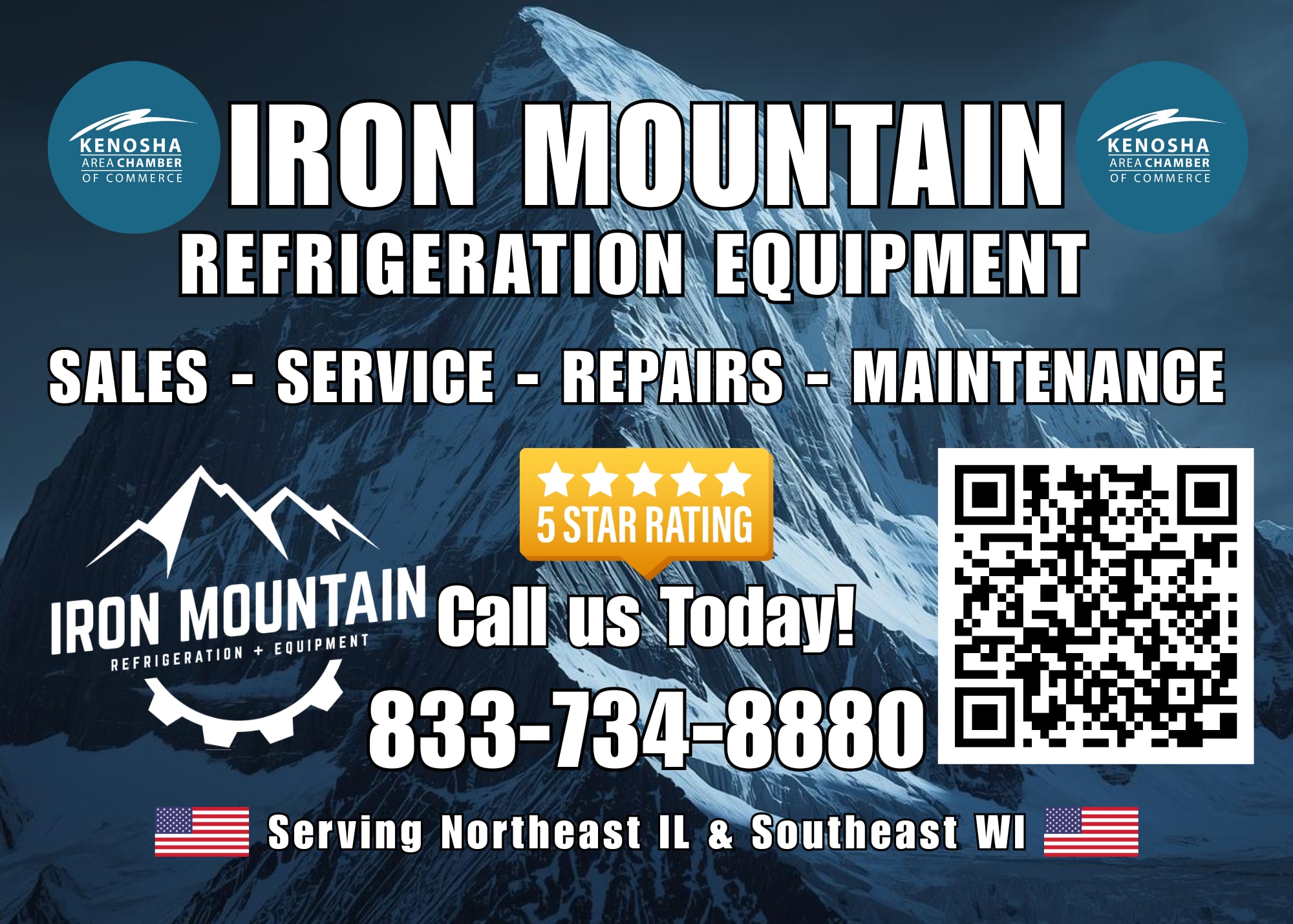 Our gift to you from Iron Mountain Refrigeration! Kenosha Area Chamber of Commerce Members, enjoy an additional $100 OFF our already low prices when you purchase $1,000 or more worth of refrigeration or freezer equipment! Use code KACC when ordering or scan the QR code in the digital postcard.